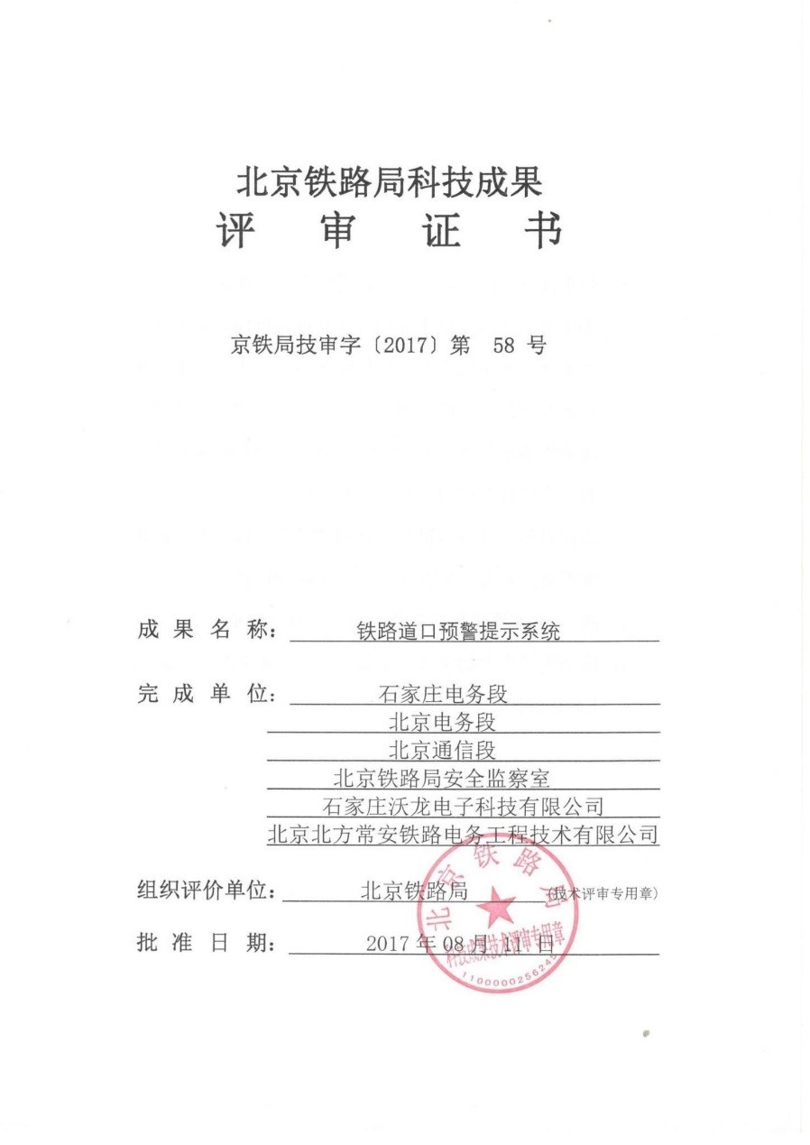2017年8月10日,“鐵路道口預警提示系統”通過了中國鐵路北京局集團有限公司科學技術委員會技術評審,評審專家一致認為:該系統達到國內領先水平。